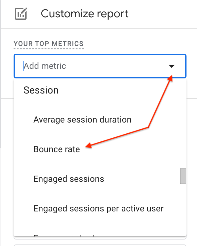 Scroll to and Session and select Bounce rate from the list.