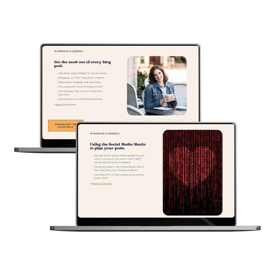 • The Social Media Matrix helps you repurpose blog content for social media. It’s filled with suggestions for what kinds of posts you can create for whichever platform(s) you are using. The sheet imports your content plan from the Prime Post Planner making it easier for you to plan your content for social media. Additionally, Social Media Expert Annie Schiffmann of Downstage Media joins us inside the course where she gets real clear on the purpose of Social Media in your business and she makes several suggesitons for the best way to get the most out of your blog posts.