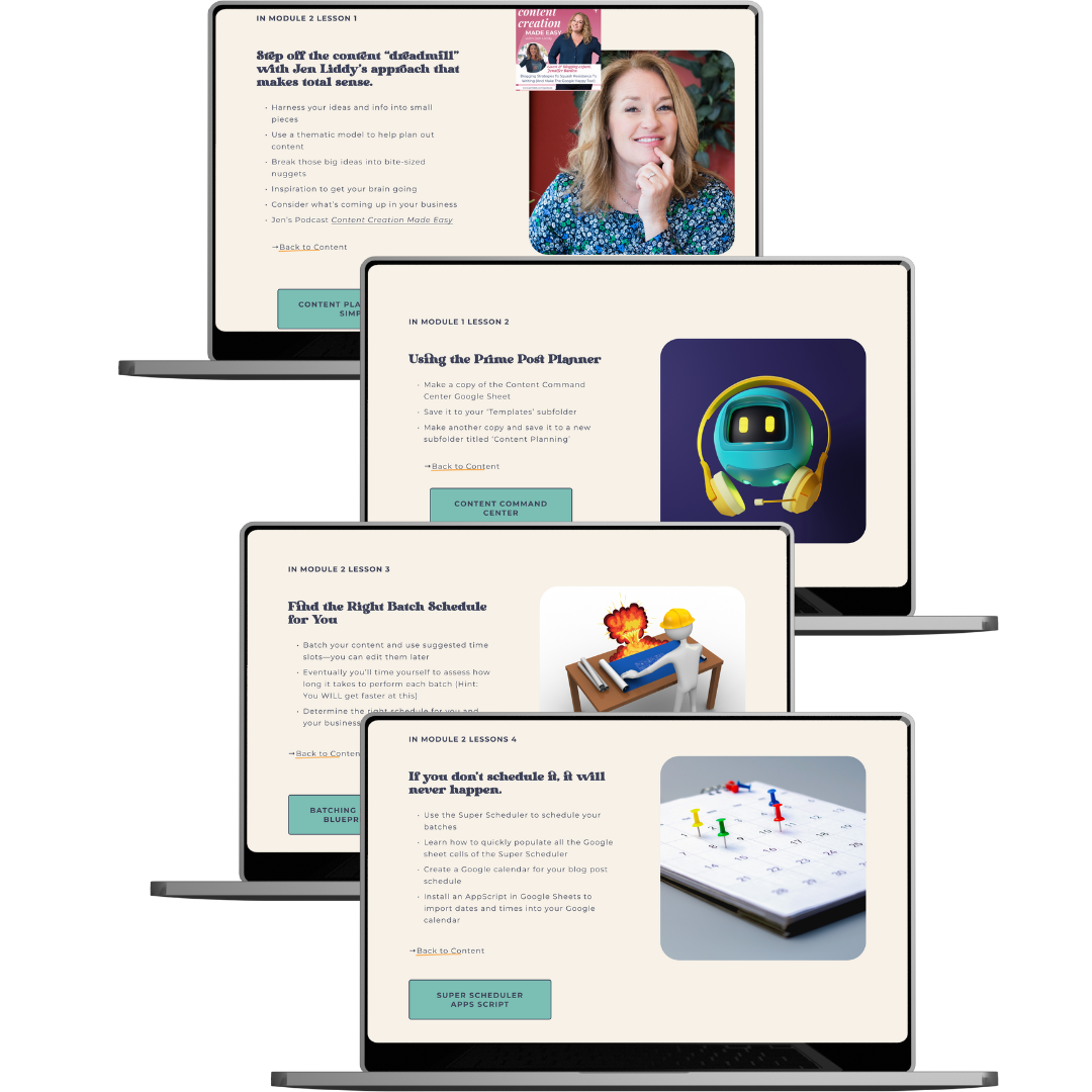 • By far this was my biggest challenge as a blogger. That's why I didn't mess around—I called in an expert, Jen Liddy of Jen Liddy Coaching & Development who teaches this module herself! I've researched the best ways to batch your content and provided 3 different batching options as well as batching tips to help you determine a schedule that will work for you. The Super Scheduler inside the course will blow your mind! I show you how to quickly schedule your batches and auto-populate them into your Google Calendar.