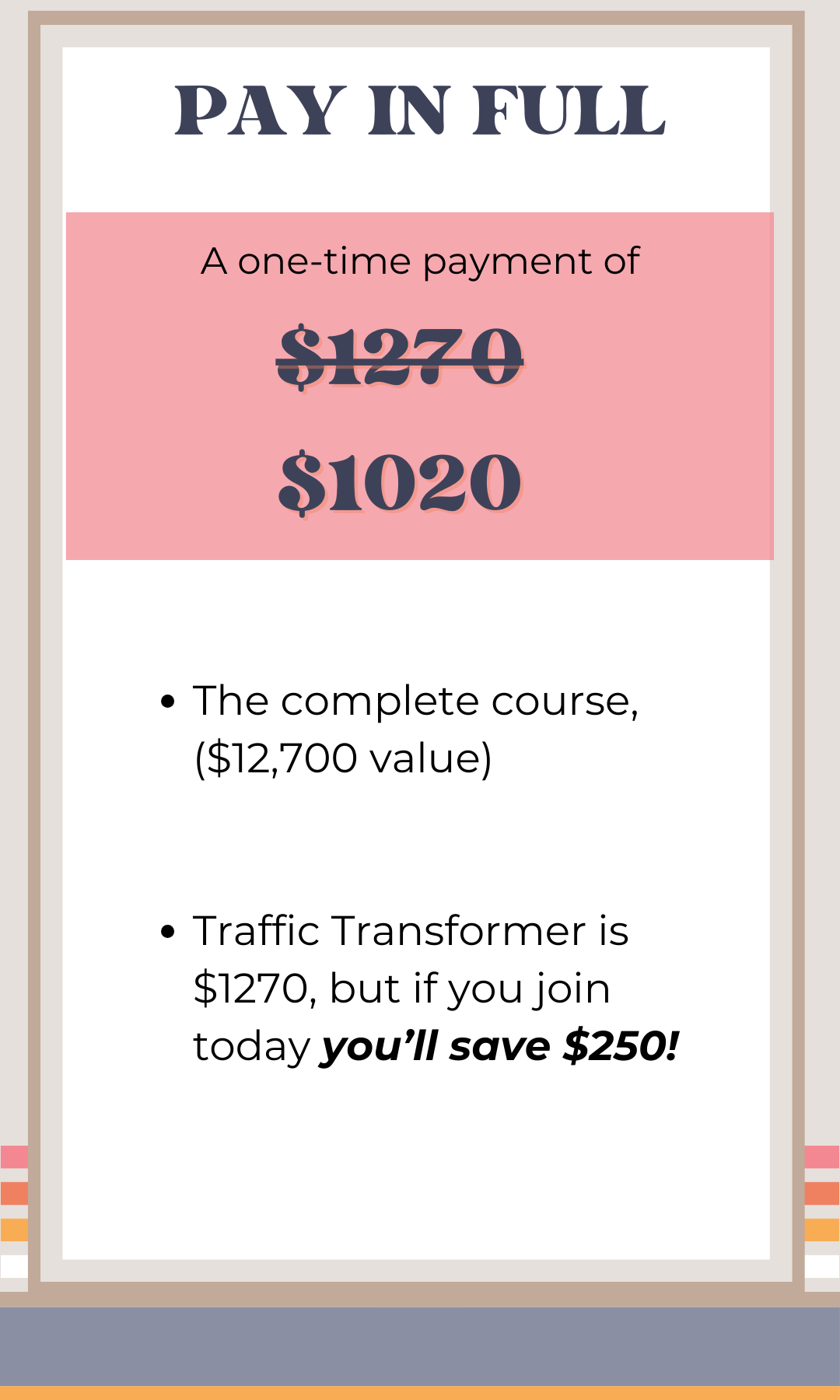 When you enroll in Traffic Transformer, you get lifetime access so you can start now or start later and the course won’t be going anywhere.