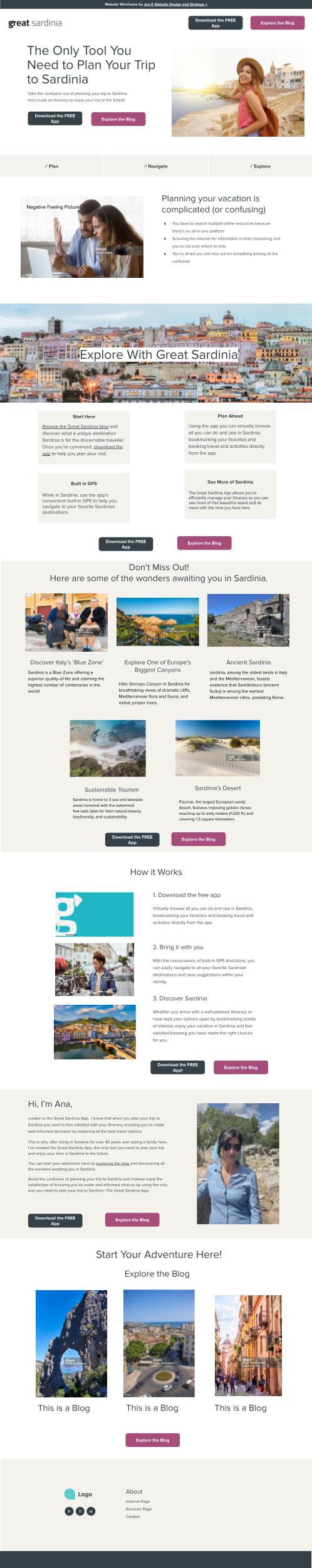 Ana was able to hand this wireframe off to her web designer who did a fantastic job creating a beautiful and engaging website for her Great Sardinia App.